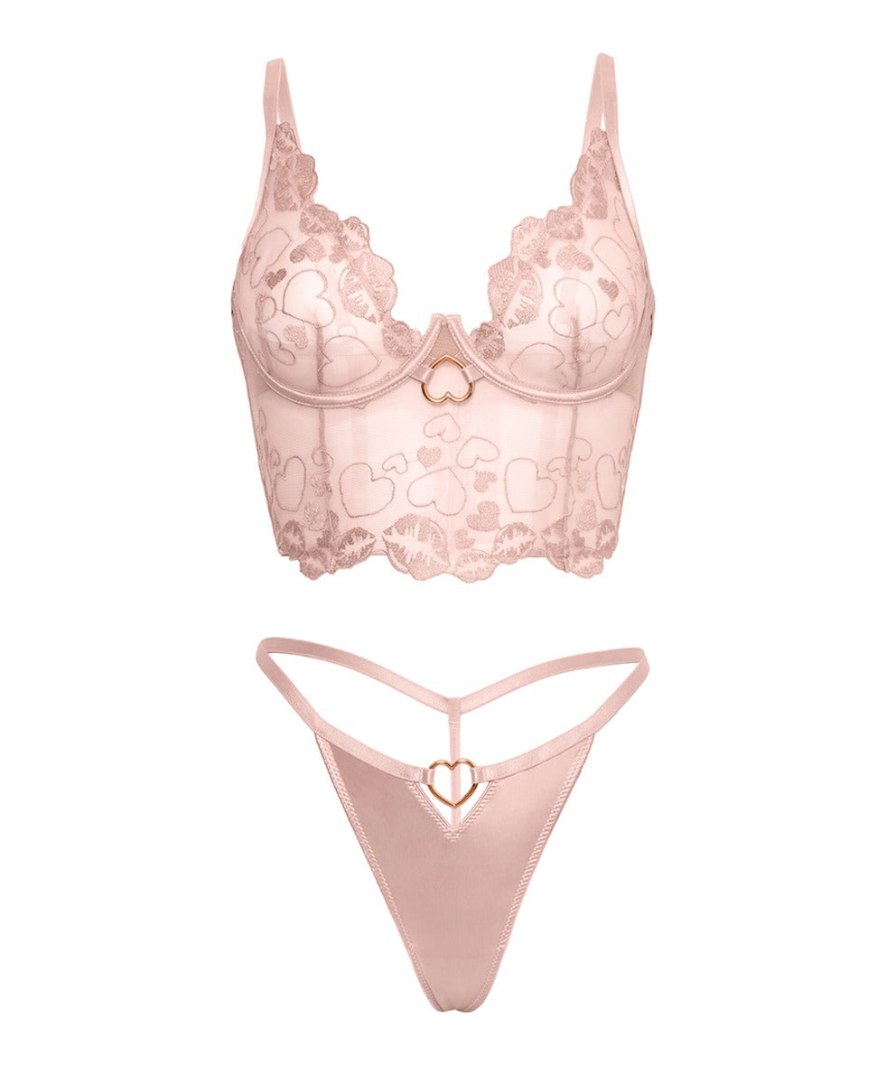 Be ready to turn heads with the Clarissa Sheer Bustier Set. This unlined underwire bustier brings bold elegance with its embroidered mesh and beautiful heart ring details that catch the eye front and center. Clarissa is made for those who love to blend romance with a daring edge. Slip it on and own the spotlight—because subtle is never your style.