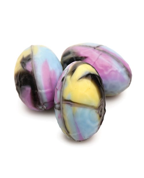 The pastel blue, yellow, pink and black rod has a unique texture of whorls, ridges, grooves and spikes that will send you to another world of pleasure! The hollow center is wide enough for the 3 silicone eggs to slip through and impregnate you with!