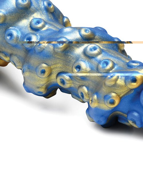 "This Kraken Silicone Dildo is here to add to your deviant, deep-sea fantasy collection! With a deep blue and shimmering gold color, it's automatically an eye-catcher. The wide base doubles as a suction-cup base for hands-free rides. It can also be used with your lover when combined with a compatible strapon harness! At the base are countless, small, wave-like features that look as if they're crashing against the titanic kraken rod! As the dong emerges from the base, it has a twisted whorl that swirls up towards the tip along with several, small octopus-like suckers. The tip is tapered just enough to help with insertion but, after you get the tip in, you'll be feeling all the textures this kraken offers! Perfect for roleplay, cosplay, fantasy kink or just as a unique and satisfying toy for you or your partner! Made out of premium silicone, this dong is phthalate-free and body-safe. Use only with water-based lubricants. To wash, use warm water and mild soap then spray with a toy cleaner and pat dry.Available at FunLove.com, the largest adult toy selection at the lowest prices, with discreet shipping and billing.