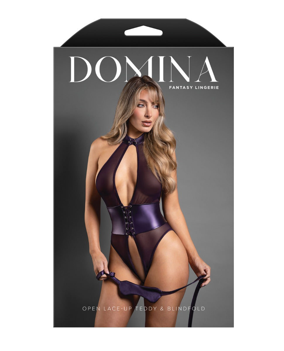 Domina Open Halter Teddy in Mesh & Leatherette w/Matching Blindfold - Purple L/XL