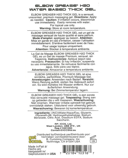 Elbow Grease H2O Thick Gel has a soft velvety smooth texture mimicking the body's own natural lubrication. It is water-based, long lasting, greaseless, safe, latex compatible, odorless and washes of with water leaving no residue on the skin. It does not contain Nonoxynol-9. Keep some handy at all times!Available at FunLove.com, the largest adult toy selection at the lowest prices, with discreet shipping and billing.