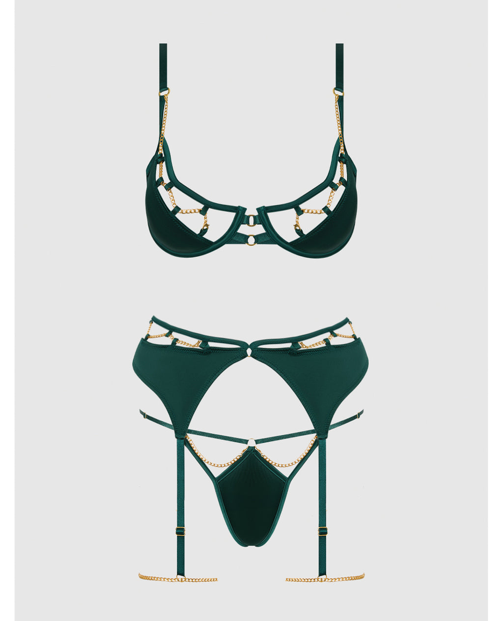 Slip on the Evangeline Satin & Chain Push Up Bra, Thigh Garter Belt & G-String and elevate the rules of seduction. This three-piece power set frames the figure with bold lines, featuring a wired demi cup bra and v-front thong that commands attention. Finished with matching garter belt with chain thigh straps for an extra layer of fierceness.