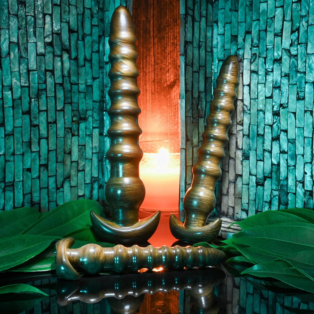 Screwing up has never felt so good! Give your back-door pleasure a twist with this 3-piece erotic ‘hardware’ set that swirls and sparkles. It’s made from firm yet pliable TPE rubber that’s alive with golden streaks and veins and features three traditional shaft shapes in small, medium and large sizes. Studded with rings for delicious incremental sensation, each flexible size offers a different girth for your mood. Tapered tip for comfortable entry. Wide safety base for blissfully easy navigation.