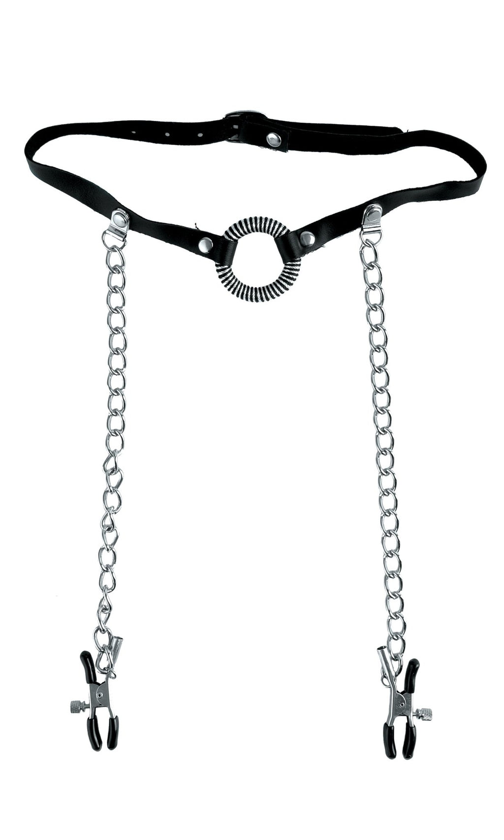 Get your lover to open wide and say ahhhh with this naughty Pipedream Fetish Fantasy O-Ring Gag with Nipple Clamps. The gag consists of a small metal O-ring wrapped in leather, connected to two sturdy leather straps. Two chained nipple clamps keep your nipples perky, and the coated clamps easily adjust to fit your desired tension. The leather straps adjust to fit most sizes, pulling the ring tight and keeping the mouth open wide. You're in control over when and how often your lover speaks...what you do next is up to you!