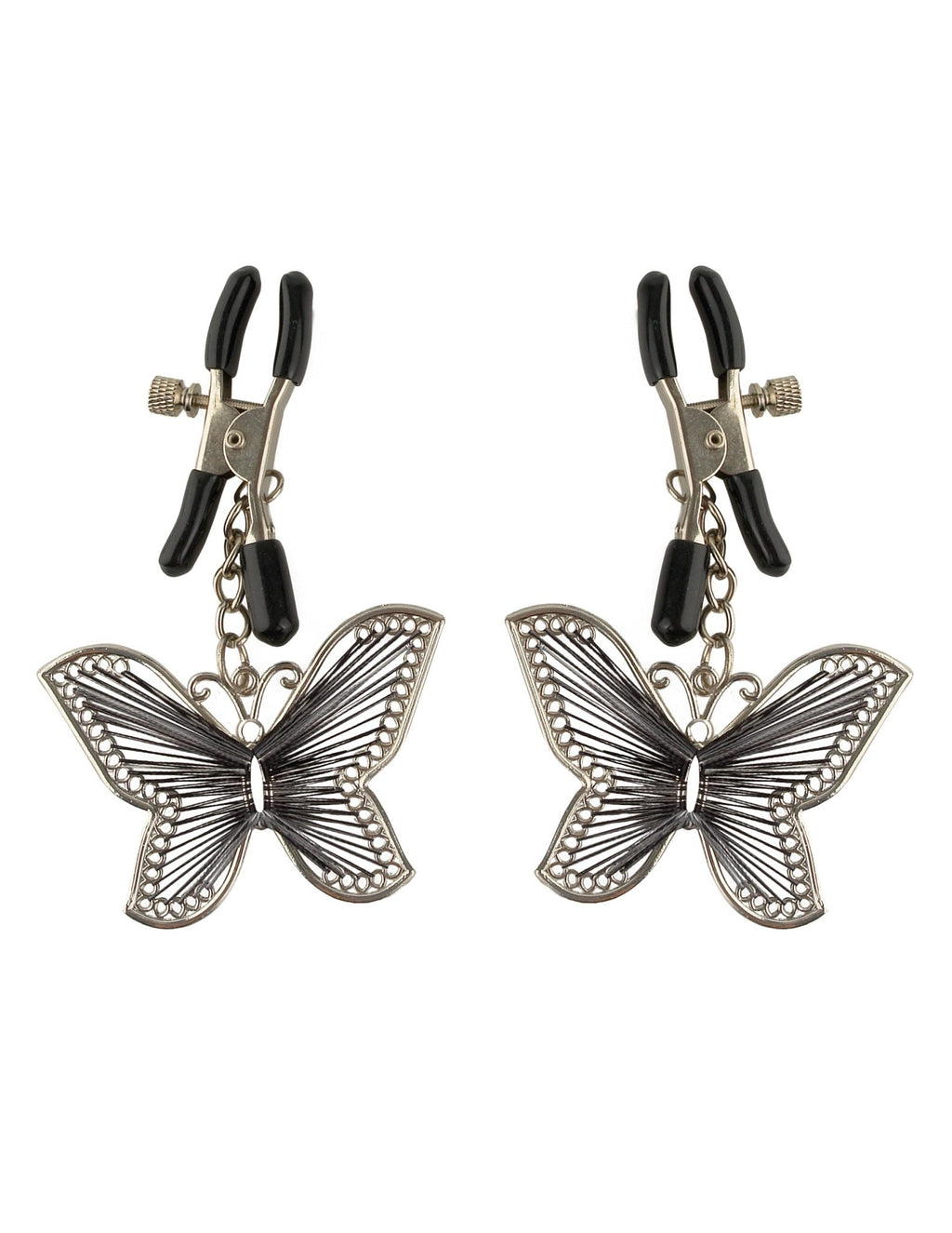Make your nipples perk with pleasure with these beginner Pipedream Butterfly Nipple Clamps. Made with durable metal clips and covered in soft rubber liners, these clamps are perfect for beginners and fetish enthusiasts alike. The amount of pressure you apply to the nipple is adjustable by turning the screw, while the butterflies give you subtle stimulation with each movement.