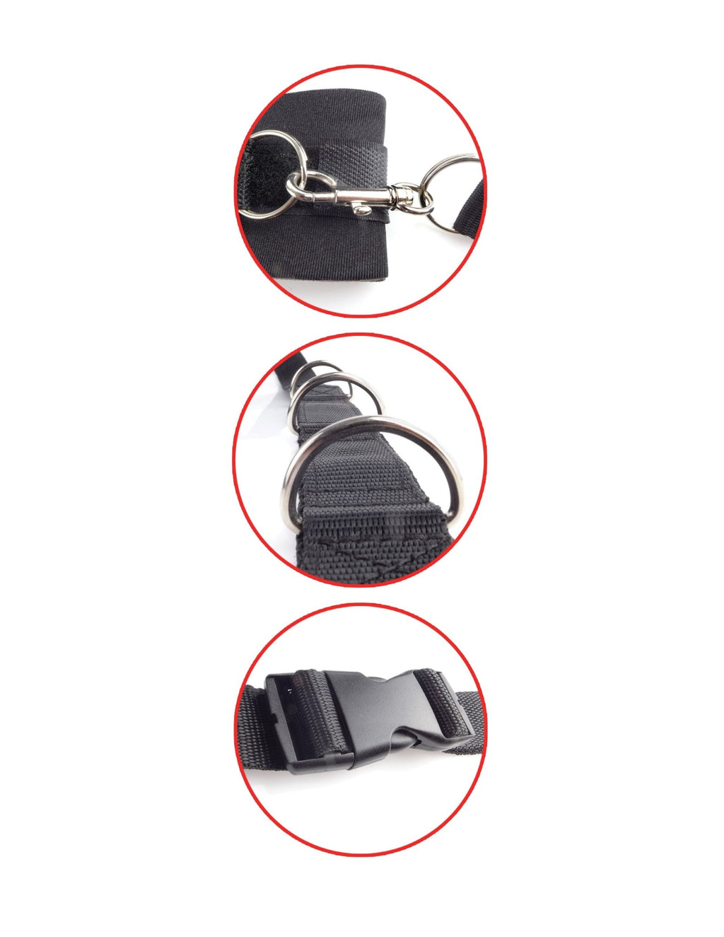 This versatile restraint system features two large nylon straps that wrap around your headboard and footboard and connect to 4 tethers and cuffs. Each tension strap features 6 metal D-rings that allow you to clip the tethers anywhere you want, creating elaborate bondage scenarios without tying knots or using hardware. The kit can be used with any size mattress and sets up easily in minutes. It's perfect for beds without bed posts and can be used on couches as well. The four adjustable nylon tethers feature sturdy metal clips that connect to the tension strap D-rings on one end and adjustable cuffs on the other. Simply slide the tension strap around your headboard, pull the strap until its tight, then close the self-locking clamp to keep the strap in place. Repeat the same steps with your footboard and you're ready to enjoy a night of light bondage play. The cuffs easily adjust to fit your wrists or ankles, allowing you to explore new positions you never thought were possible. Use your imagination and there's no limit to the fun!