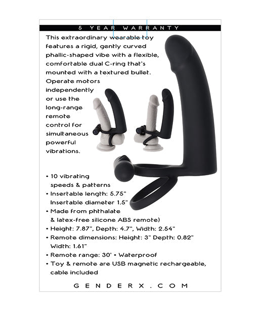This extraordinary wearable toy features a rigid, gently curved phallic-shaped vibe with a flexible, comfortable dual C-ring that’s mounted with a textured bullet. Operate motors independently or use the long-range remote control for simultaneous powerful vibrations.