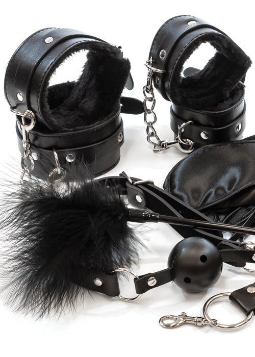 Everything you need to experience a thrilling night of BDSM and fetish play as a beginner is waiting for you in this luxurious and complete Bondage Kit! With a flogger, ball gag, eye mask, hand and ankle cuffs, and a feather tickler, plus a hog tie connector, you'll be ready for an unforgettable excursion.