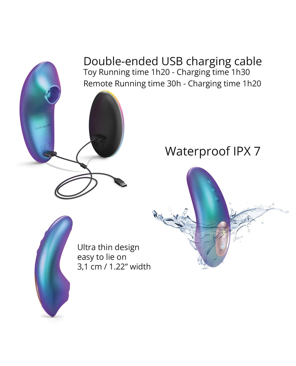 Dreamer has 5 Flapping modes and 8 intensities per Flapping mode! 40 combinations, enough to keep everyone happy. Give the gamepad to your partner, the remote control with LED backlighting will get things going. In the dark or during the day, the LED backlit design, as aesthetic as it is practical, allows you to see the change in mode at a glance. Like all Wonder Project pieces, it has the Flapping design. The silicone mouth hugs the clitoris to create a sound box and therefore amplifies the sensations generated by the rhythmic up and down movements of the flexible silicone membrane. The cunnilingus effect is memorable! Don't say no to a little dip from time to time, it's waterproof.