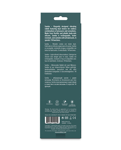 Samba – Elegantly designed vibrating rabbit featuring dual motors for endless combinations of pleasures and sensations. Made from flexible and pliable body-safe silicone, Samba is rechargeable, water resistant, and suitable with all lubricants. 6 speeds / 14 functions.