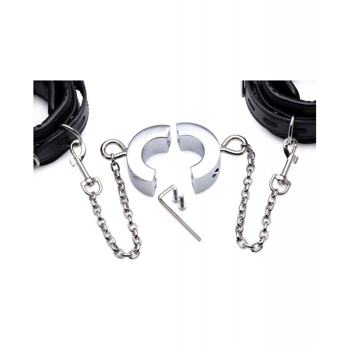The ankle cuffs can be adjusted to find the perfect fit and feature three D-ring attachment points to fasten your choice of restraints to lock them down further! The ankle cuffs feature locking buckles if you choose to add your favorite padlock into the mix. The Ball stretcher ring features additional attachment points for more weights or more restraints - experiment with your lover and see how far you can stretch their limits!