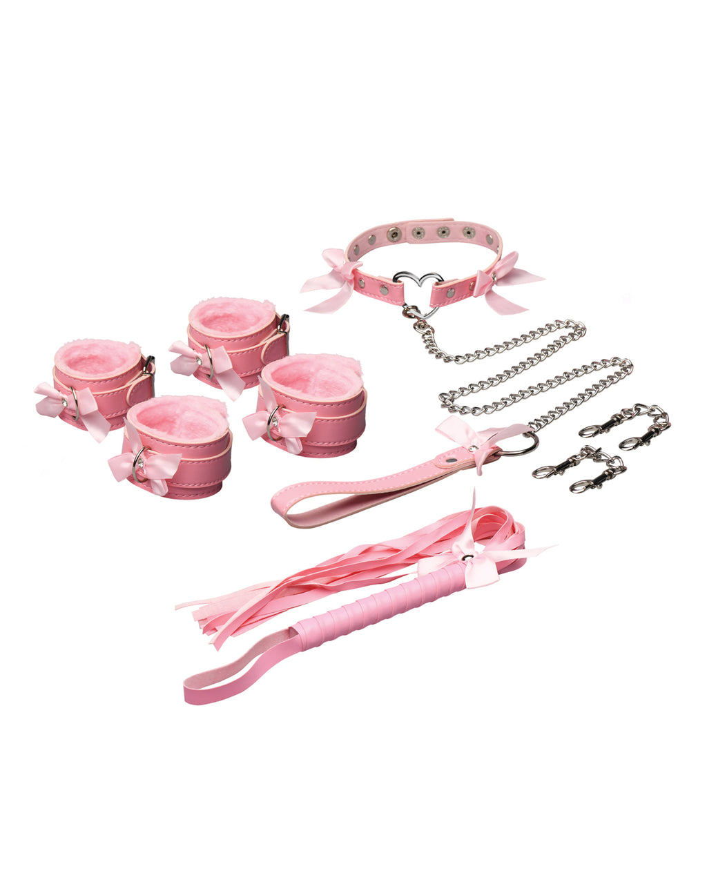Explore your playful side with the Kawaii Bondage Set, a sweet addition to any personal collection! This endearing pink set features a collar, chain leash, matching wrist and ankle cuffs, chain connectors, and a lovely flogger to complete the set.