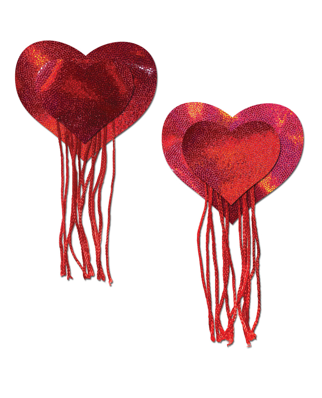Tassels: Red Holographic Hearts with Tassel Fringe Nipple Pasties by Pastease® are hand-made in the USA of soft form-fitting glittery material that forms seamlessly to curves and resists wrinkling over hardening nipples.