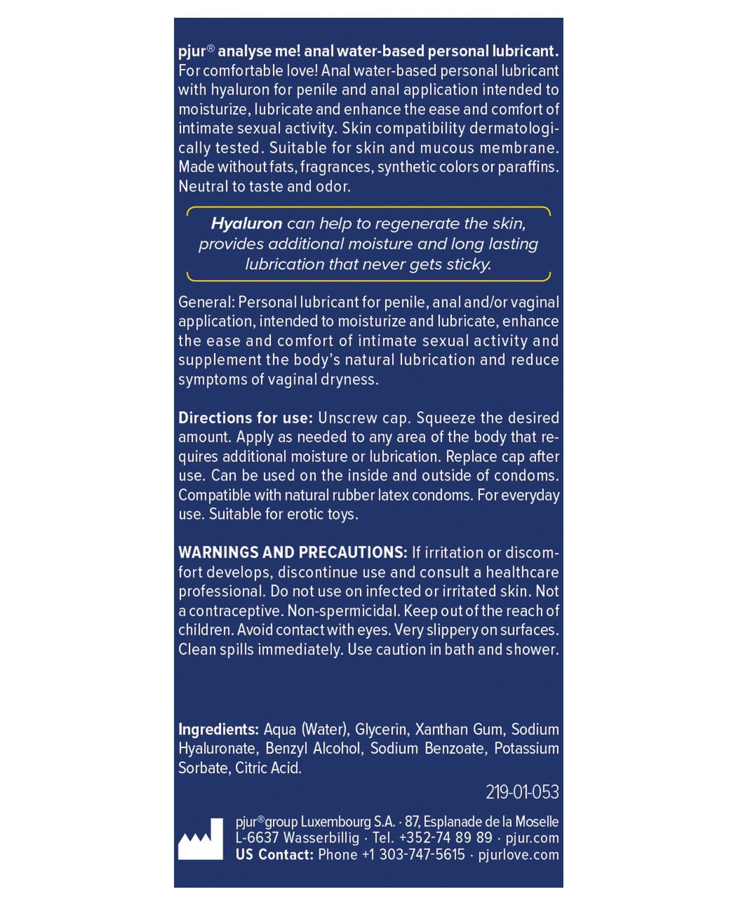 pjur® analyse me! Moisturizing is a water-based personal lubricant with Sodium Hyaluronate (Hyaluronan) to moisturize the skin. It feels like your own natural moisture. Helps to replace personal moisture to support lubrication especially during anal sexual intercourse. Biocompatible with skin/mucous membrane. Made without synthetic colors, fats, paraffins, perfume or added flavors. For everyday use. Suitable for erotic toys.