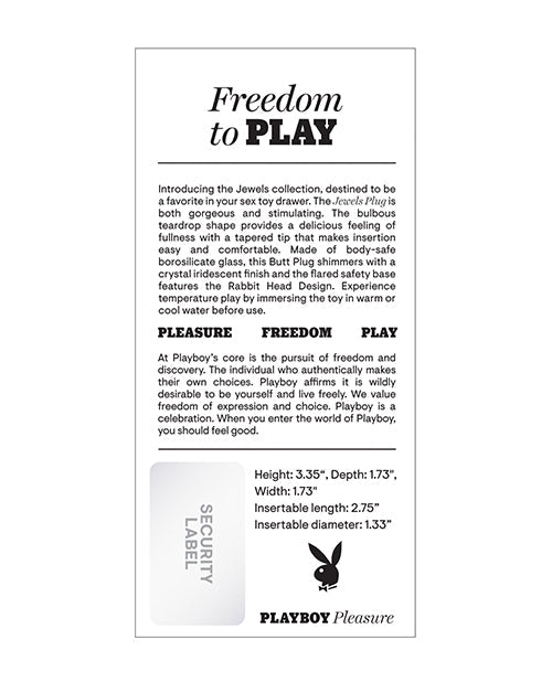 Introducing the Jewels collection, destined to be a favorite in your sex toy drawer. The Jewels Plug is both gorgeous and stimulating. The bulbous teardrop shape provides a delicious feeling of fullness with a tapered tip that makes insertion easy and comfortable. Made of body-safe borosilicate glass, this Butt Plug shimmers with a crystal iridescent finish and the flared safety base features the Rabbit Head Design. Experience temperature play by immersing the toy in warm or cool water before use. Five Year Warranty.Available at FunLove.com, the largest adult toy selection at the lowest prices, with discreet shipping and billing.