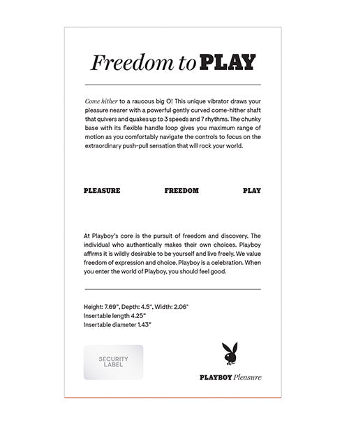 Come hither to a raucous big O! This unique vibrator draws your pleasure nearer with a powerful gently curved come-hither shaft that quivers and quakes up to 3 speeds and 7 rhythms. The chunky base with its flexible handle loop gives you maximum range of motion as you comfortably navigate the controls to focus on the extraordinary push-pull sensation that will rock your world.