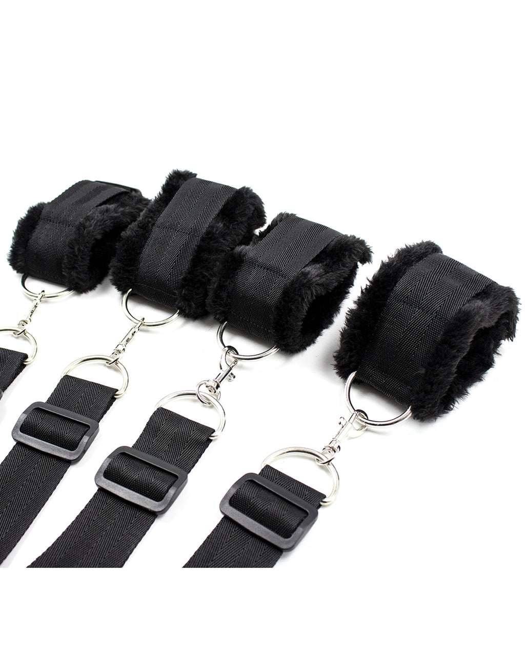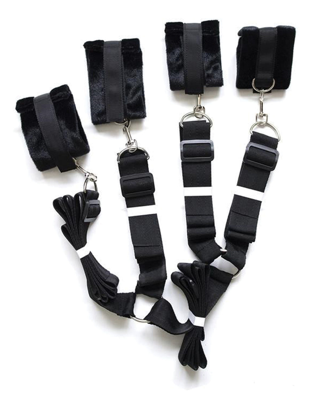 Bedroom bondage kit includes fuzzy and comfortable wrist and ankle cuffs plus all the attachments to turn any bed into your bondage bed. No bed posts needed with the cuff attachment that connects all cuffs under the bed, without having to tie up to bed posts.