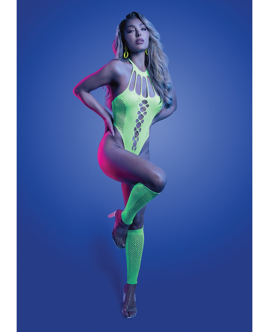 Pressure Point UV Reactive Rhinestone Studded Teddy & Gloves/Leg Warmers 2 pc Set - Neon Green O/S