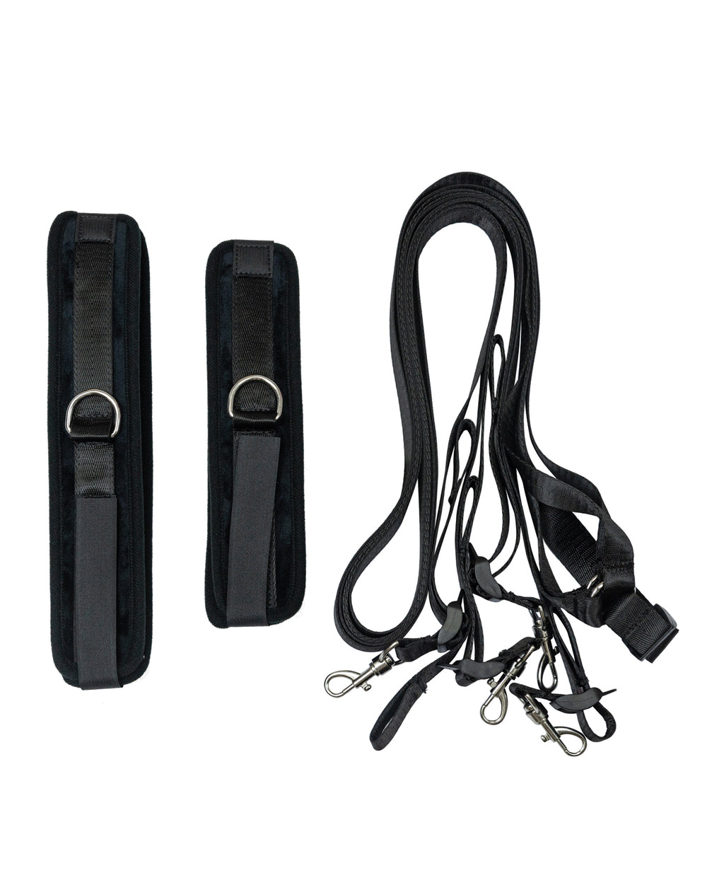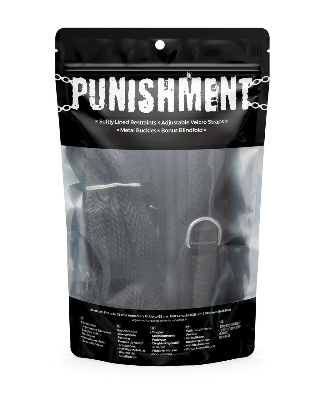 Turn your bed into a sexy submission playground with the Punishment 5-Piece Bed Restraint Kit! This set includes 2 wrist cuffs, 2 ankle cuffs, and a fully adjustable strap system that will fit most bed sizes. The cuffs are adjustable, so find the perfect fit with the Velcro straps and cut off any excess. For any couples looking to explore the world of light bondage and restraint play, this kit is a great way to discover those hidden pleasures and desires. Place the straps under the bed and stretch them out to reach over top of the mattress. Adjust them to get the perfect length and clip on the cuffs. Now the fun begins, as you strap your partner in and feel the anticipation grow. Switch up your roles and swap between who’s the Sub and who’s the Dom so you can both discover the pleasure of giving up control and taking it away. Each cuff is soft and comfortable, so you’ll be able to wear these restraints for however long your punishment lasts. Play around with different positions and discover new favourites, unleashing hidden desires and powerful passions. Don’t forget to slip on the included blindfold to heighten your other senses so every touch, kiss, and lick is that much more intense. When engaging in bondage play, remember to have a safe word so you and your partner know when the intensity has reached its climax. It’s time to be punished by pleasure with Punishment.
