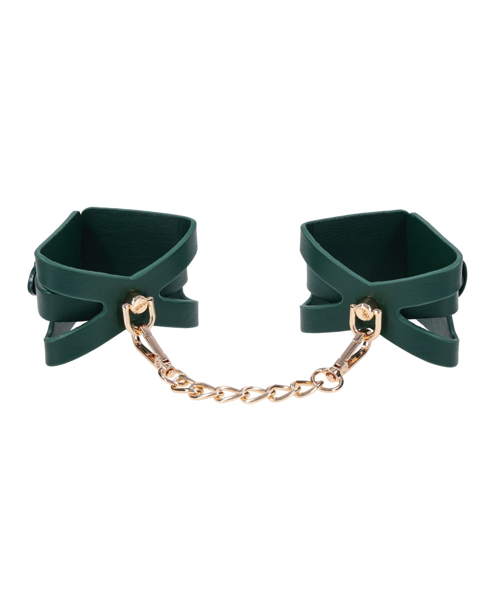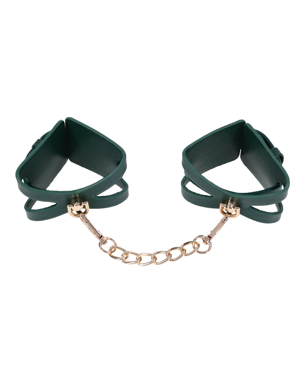 Get wrapped up in something irresistible. These emerald green cuffs feature dramatic cutout detailing to reveal more skin and spark more intrigue. Lined for softness and designed for visual seduction, they’re as comfortable as they are commanding. Use them to bind wrists together or attach to other Indica items for a coordinated scene. The gold chain and hardware add just the right touch of luxury to every surrender.