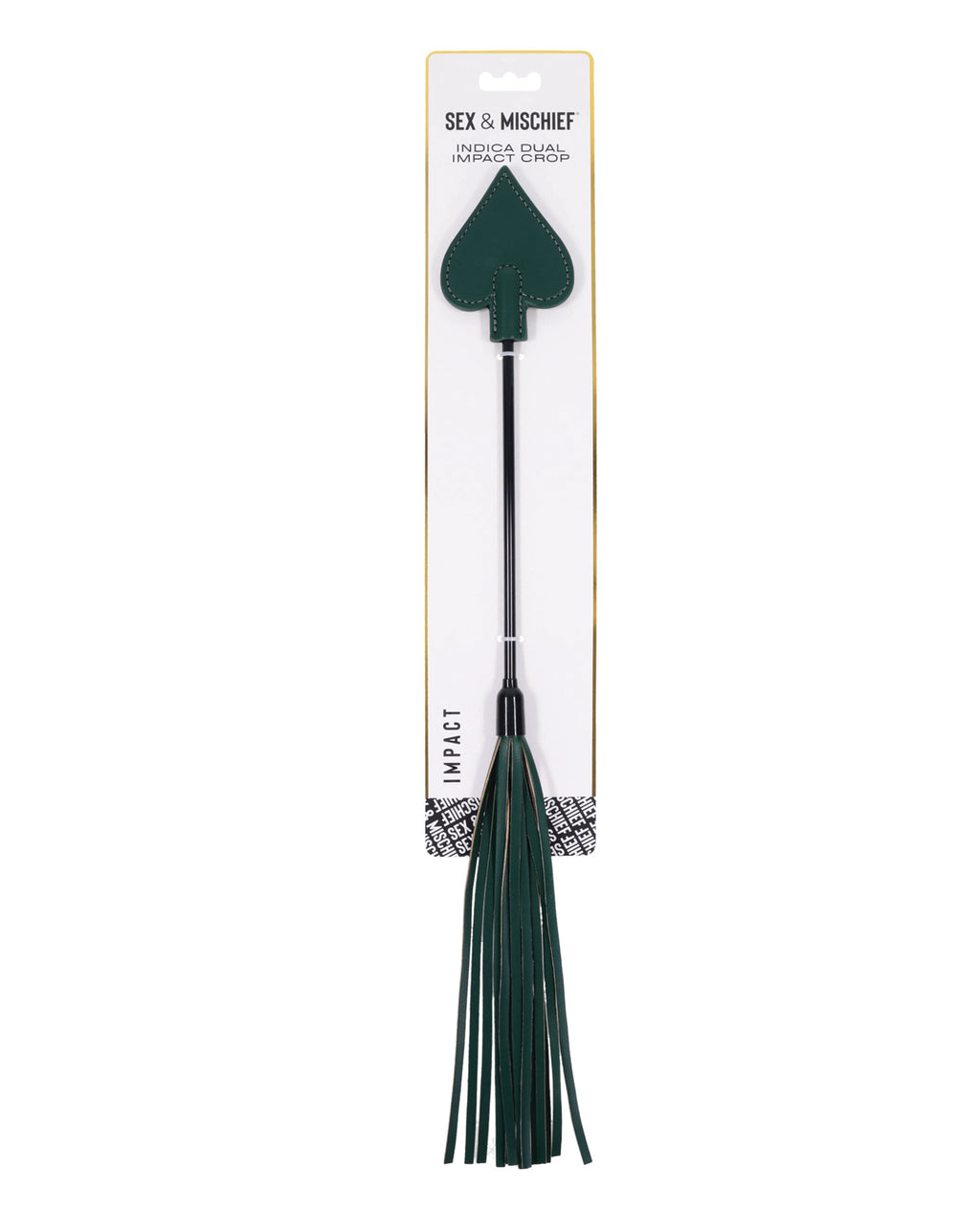 Two sensations. one seductive toy. The Indica Dual Impact Crop features a firm spade tip for crisp slaps and faux leather falls for a teasing sting. Start slow with a gentle flick or turn up the intensity — this versatile crop invites you to explore a full range of impact play. Its emerald green design and gold detailing make every scene feel like a special occasion.