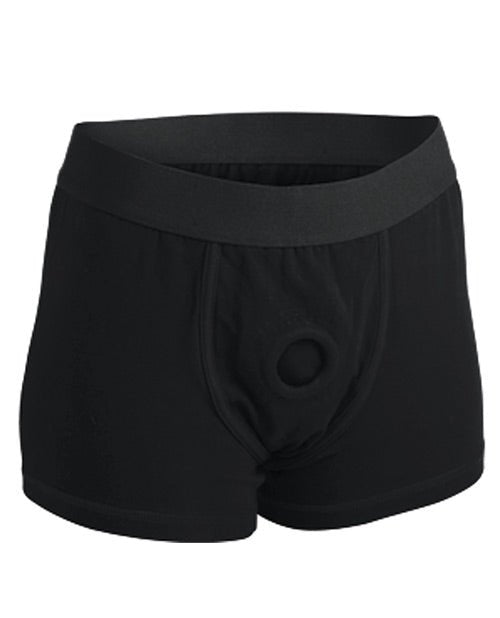 Feel more comfortable and stylish than ever before when you strap on your favorite dildo. This boxer brief style harness feels just like underwear, with an O-ring that stretches to accommodate most dildo sizes. You can even wear these cotton shorts out under your clothing, or stuff them with your favorite packer. This harness is excellent for extended wear. The supportive elastic waistband will carry the weight of your dong and you will be allowed greater mobility and position versatility. This harness is recommended for use with dildos that have a flat base that is 1.75 inches or wider. Machine washable. Material: Cotton, spandex, rubber. Measurements: LXL - Waistband measures 30 inches around , unstretched. Legs of shorts are 10 inches in length, unstretched. O-ring is 1.5 inches in diameter, unstretched.Available at FunLove.com, the largest adult toy selection at the lowest prices, with discreet shipping and billing.