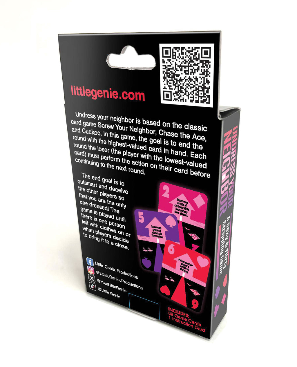 Spice up your next game night with Undress Your Neighbor, the sexy stripping card game that adds a tantalizing twist to the classic Screw Your Neighbor! Engage in an electrifying battle of wits and strategy as you aim to hold the highest-value card each round. The stakes? The player with the lowest value must perform a playful action from their card. Outmaneuver your opponents, and keep your clothes on while you watch them shed theirs. Whether you're looking for a fun icebreaker or an exciting evening with friends, Undress Your Neighbor promises unforgettable thrills and laughs. Dare to play? Grab your deck now and let the games begin!