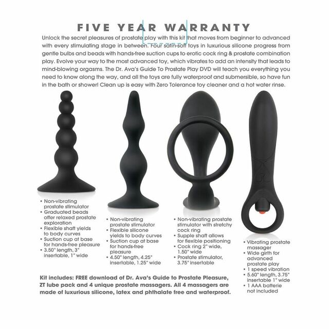 Unlock the secret pleasures of prostate play with this kit that moves from beginner to advanced with every stimulating stage in between. Four satin-soft toys in luxurious silicone progress from gentle bulbs and beads with hands-free suction cups to erotic cock ring & prostate combination play. Evolve your way to the most advanced toy, which vibrates to add an intensity that leads to mind-blowing orgasms. The Dr. Ava’s Guide to Prostate Play DVD will teach you everything you need to know along the way, and all the toys are fully waterproof and submersible, so have fun in the bath or shower! Clean up is easy with Zero Tolerance toy cleaner and hot water rinse.